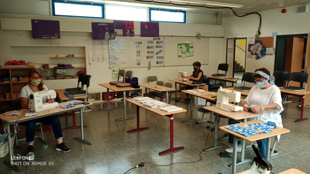 Und Mitarbeiterinnen der OGS haben fleißig für Euch Mund-Nasen-Schutz hergestellt!