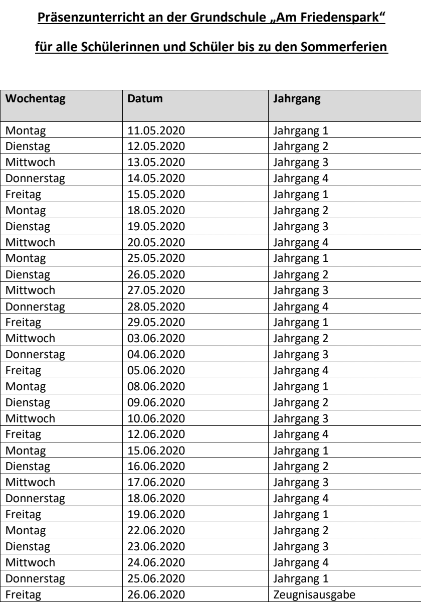 Die Unterrichtstage Ihrer Kinder bis zu den Sommerferien finden Sie in der Tabelle hier: Klick mich!