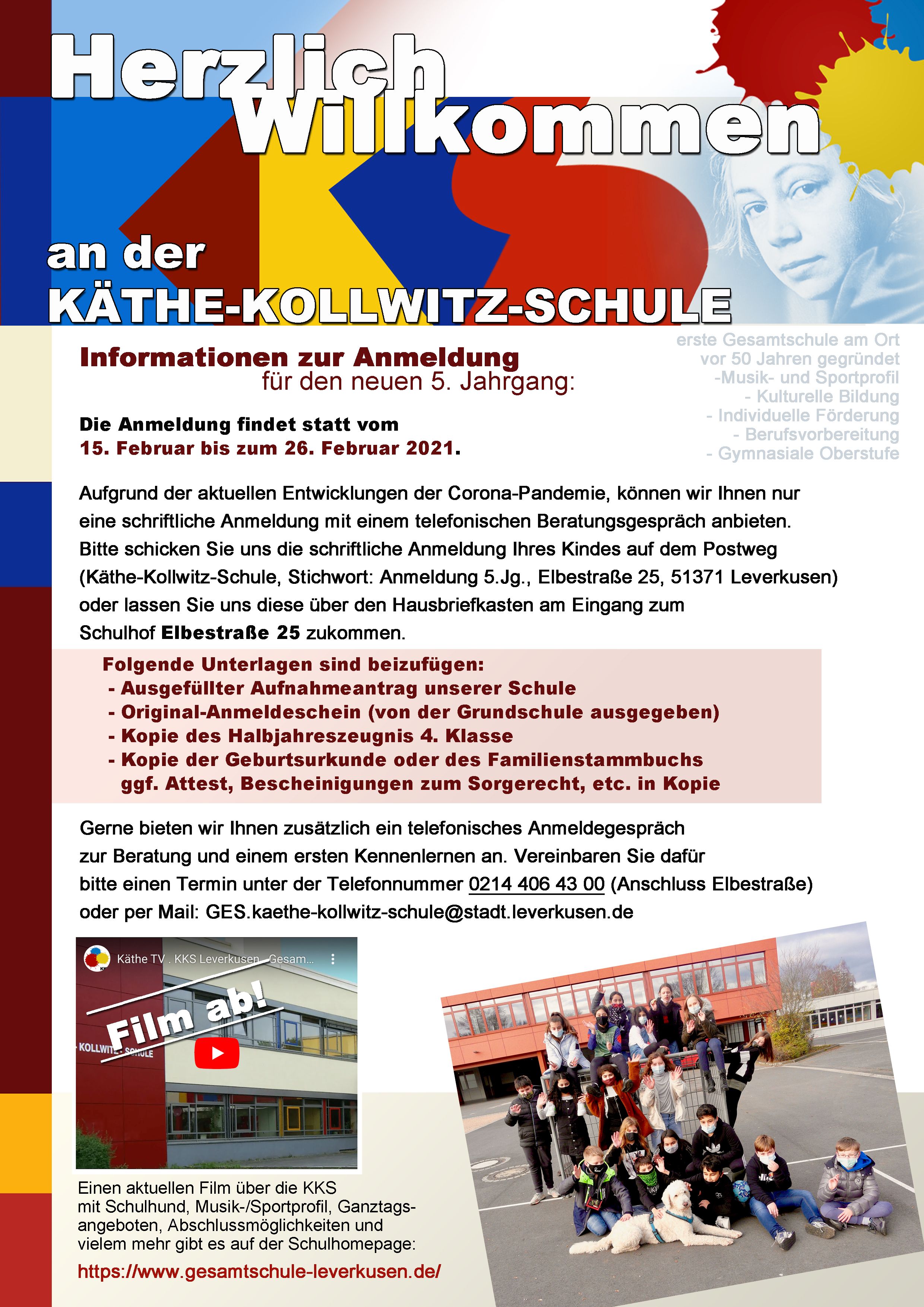 Aufgrund der aktuellen Entwicklungen zur Corona-Pandemie hat sich die Käthe-Kollwitz-Gesamtschule entschieden, für den neuen 5. Jahrgang ein schriftliches Anmeldeverfahren mit telefonischer Beratung an der Käthe-Kollwitz-Schule durchzuführen.