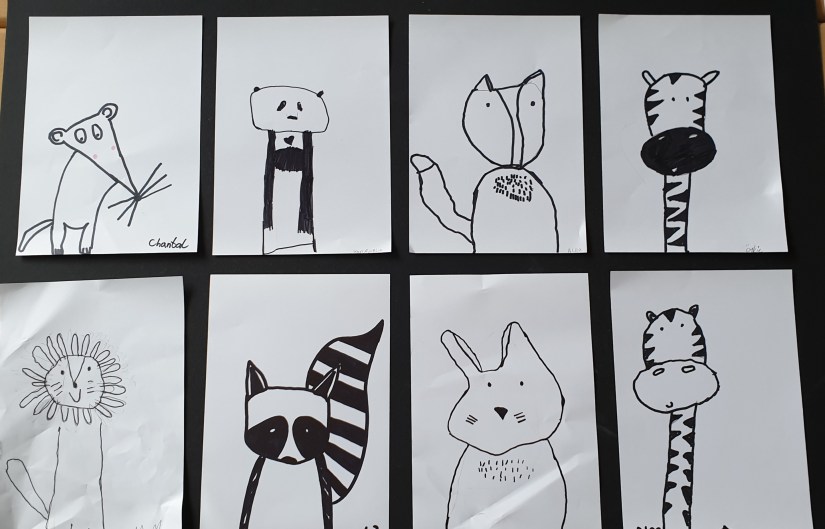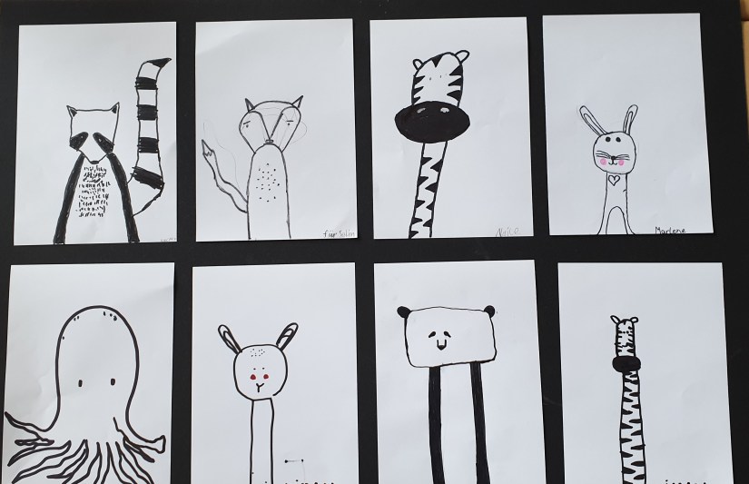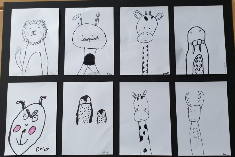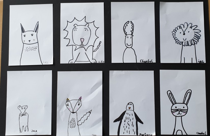 Die Aufgabe war es, ein Tier zu malen und zwar von vorne. Außerdem, wenn möglich, nur den Kopf und den Oberkörper. Nachdem die Kinder Beispiele betrachten haben, ging es los.