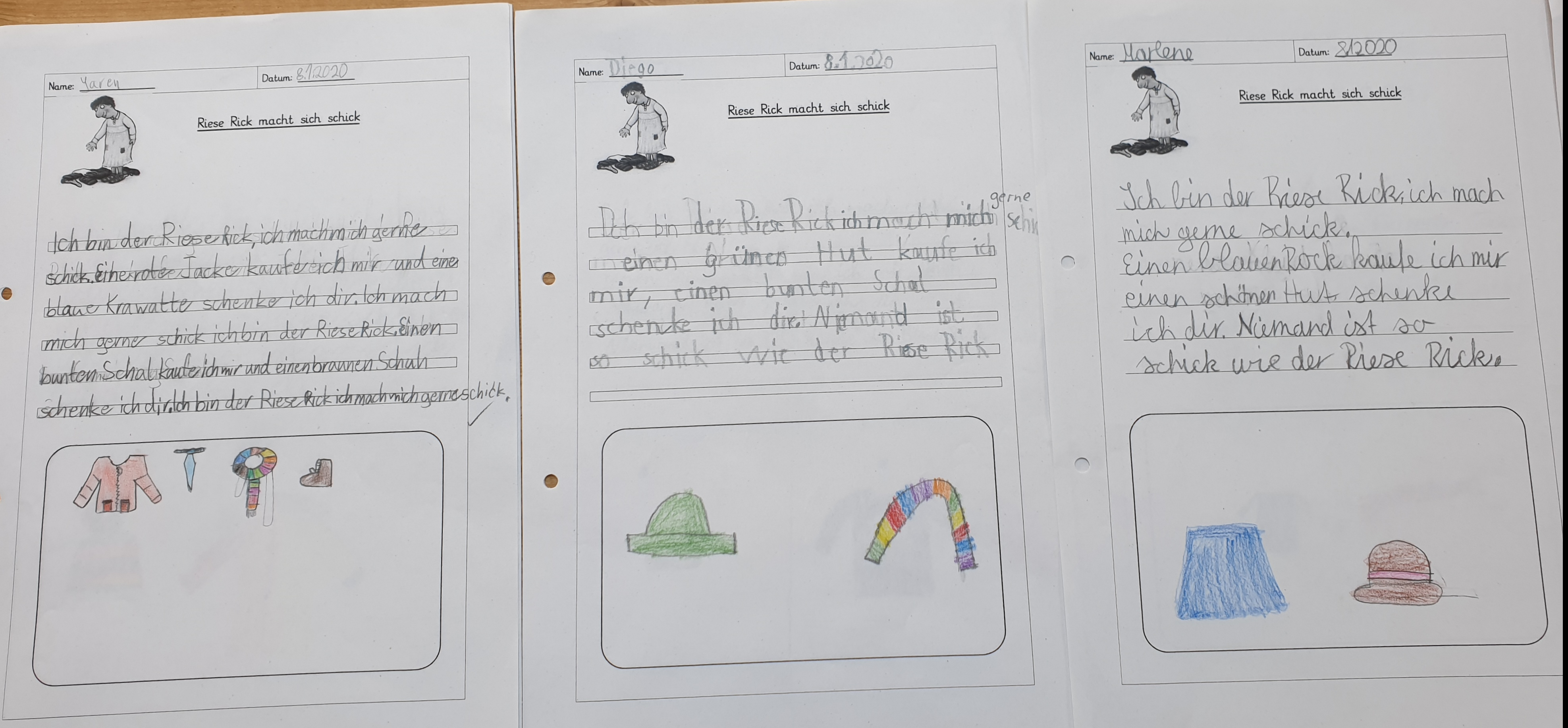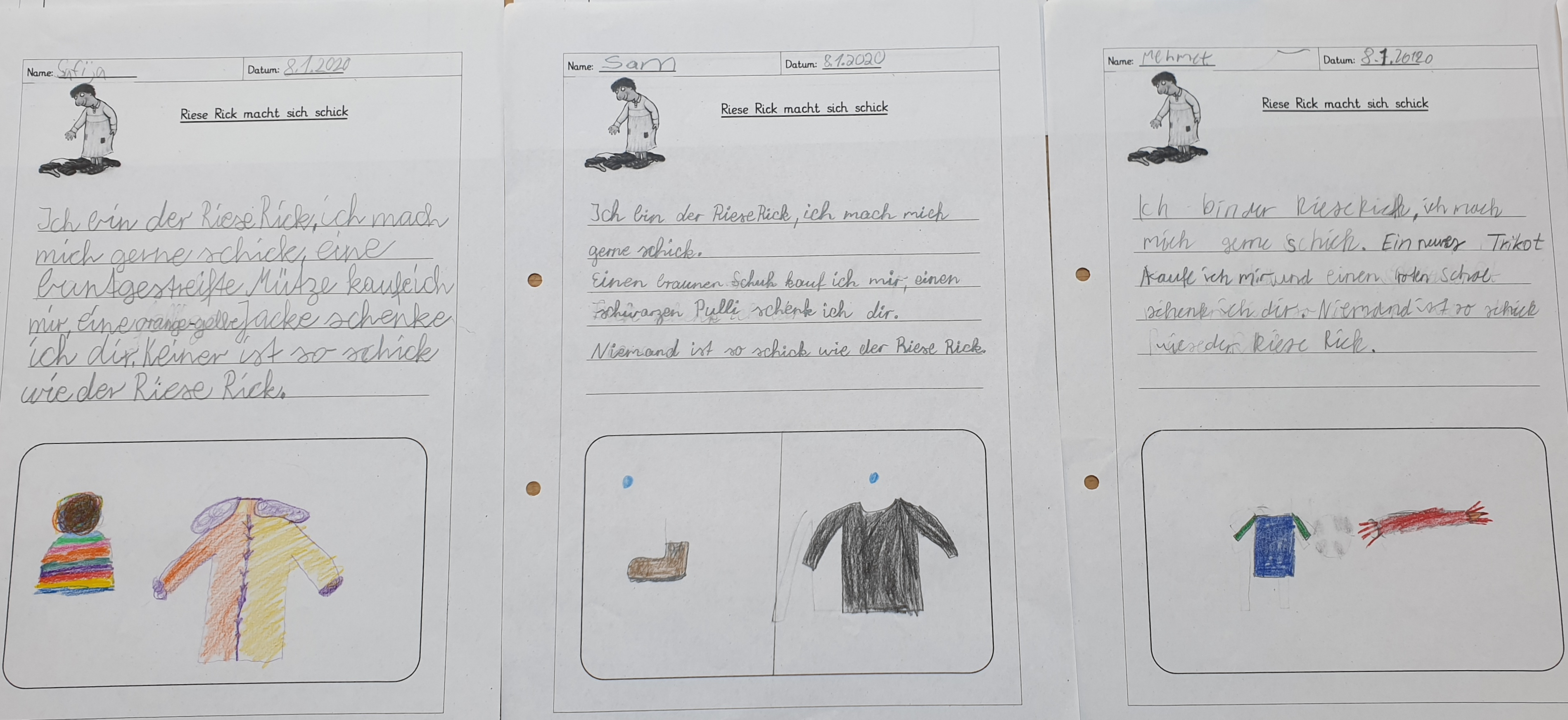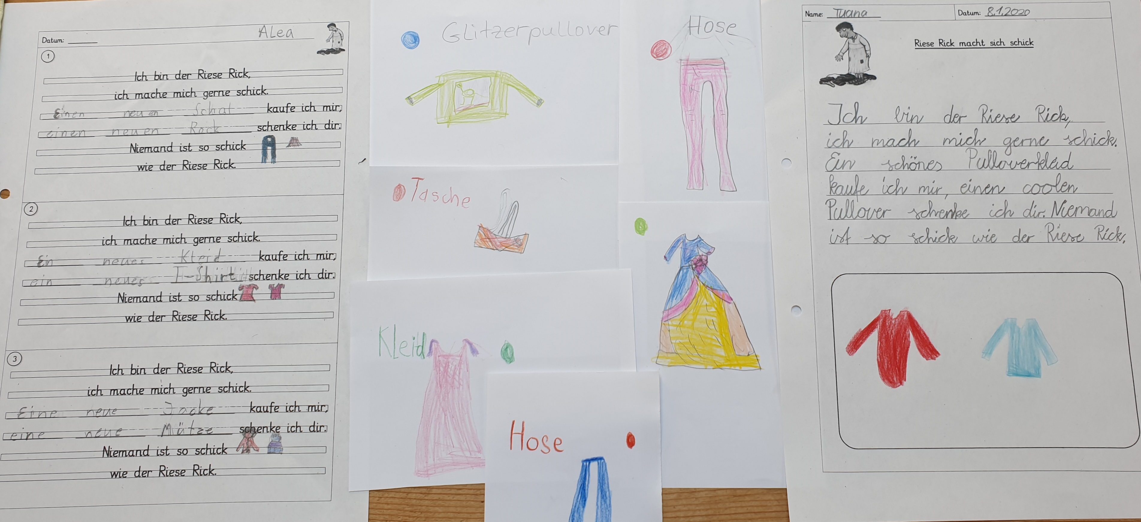 Die Lerngruppe sammelte Wörter für Kleidungsstücke und Adjektive / Wiewörter, die zu den Kleidungsstücken passen, lernt den Reim auswendig und setzt zunächst mündlich ihre eigenen Ideen ein.