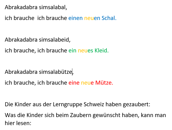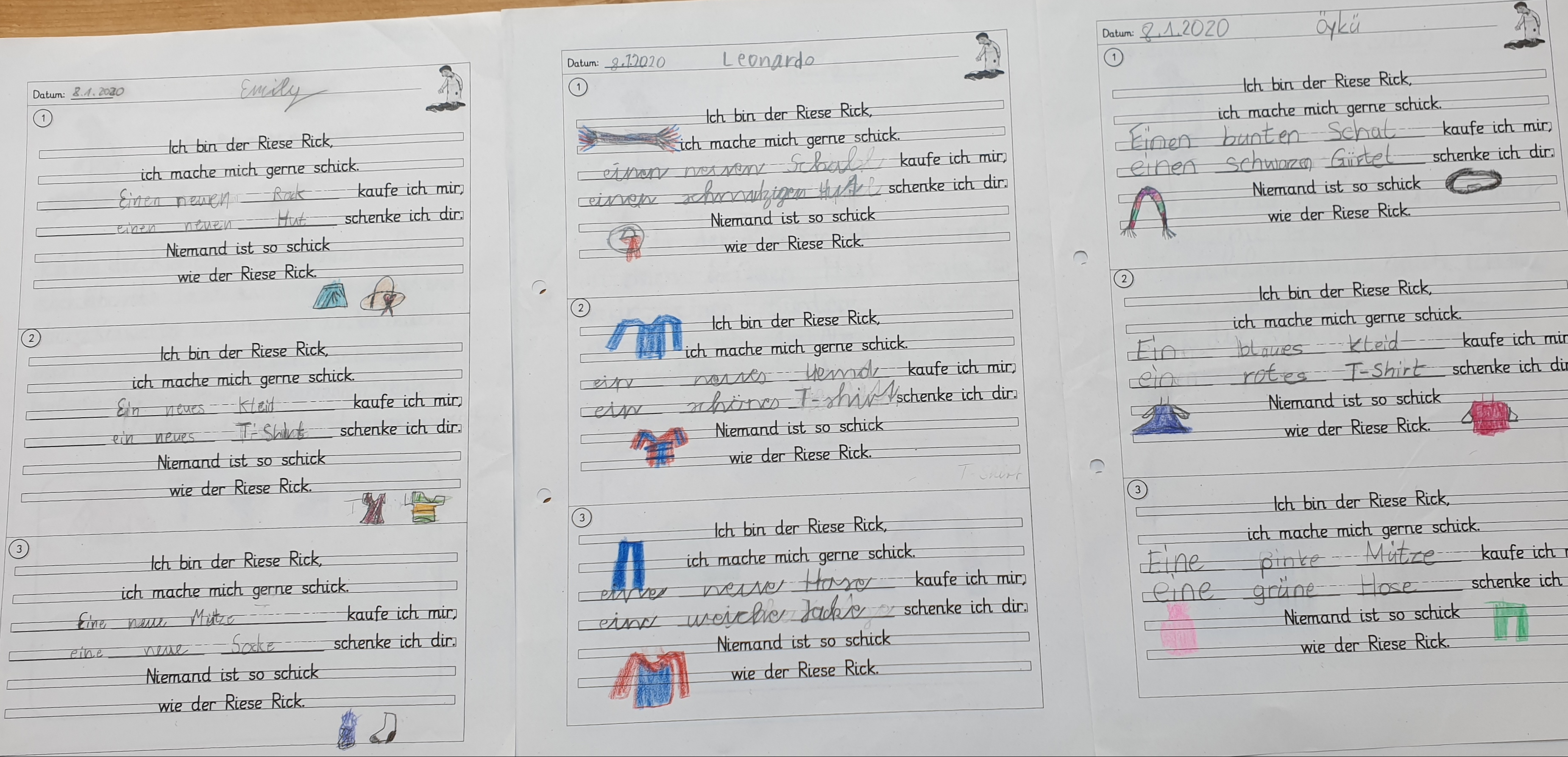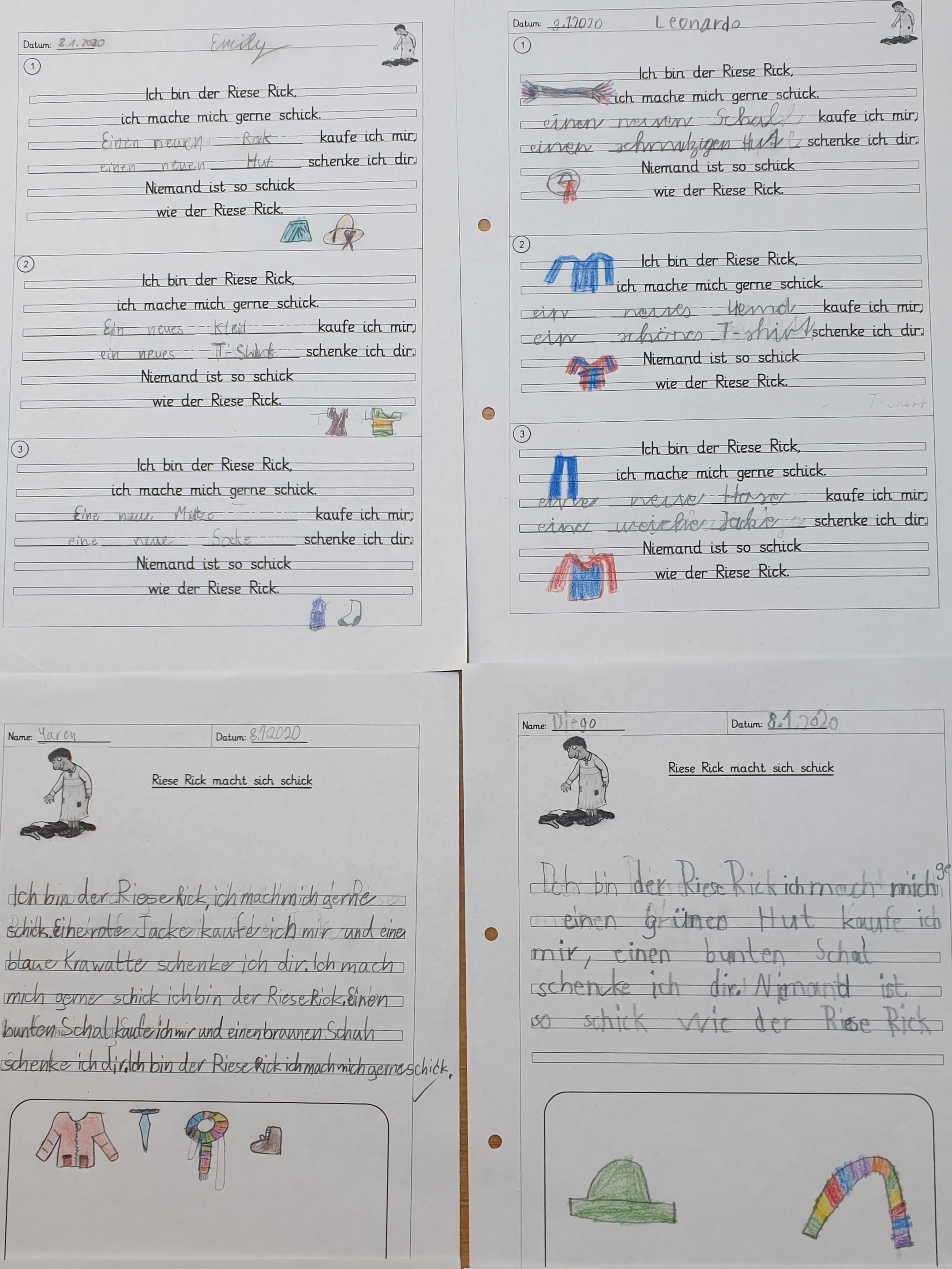 Die Lerngruppe sammelte Wörter für Kleidungsstücke und Adjektive / Wiewörter, die zu den Kleidungsstücken passen, lernt den Reim auswendig und setzt zunächst mündlich ihre eigenen Ideen ein.